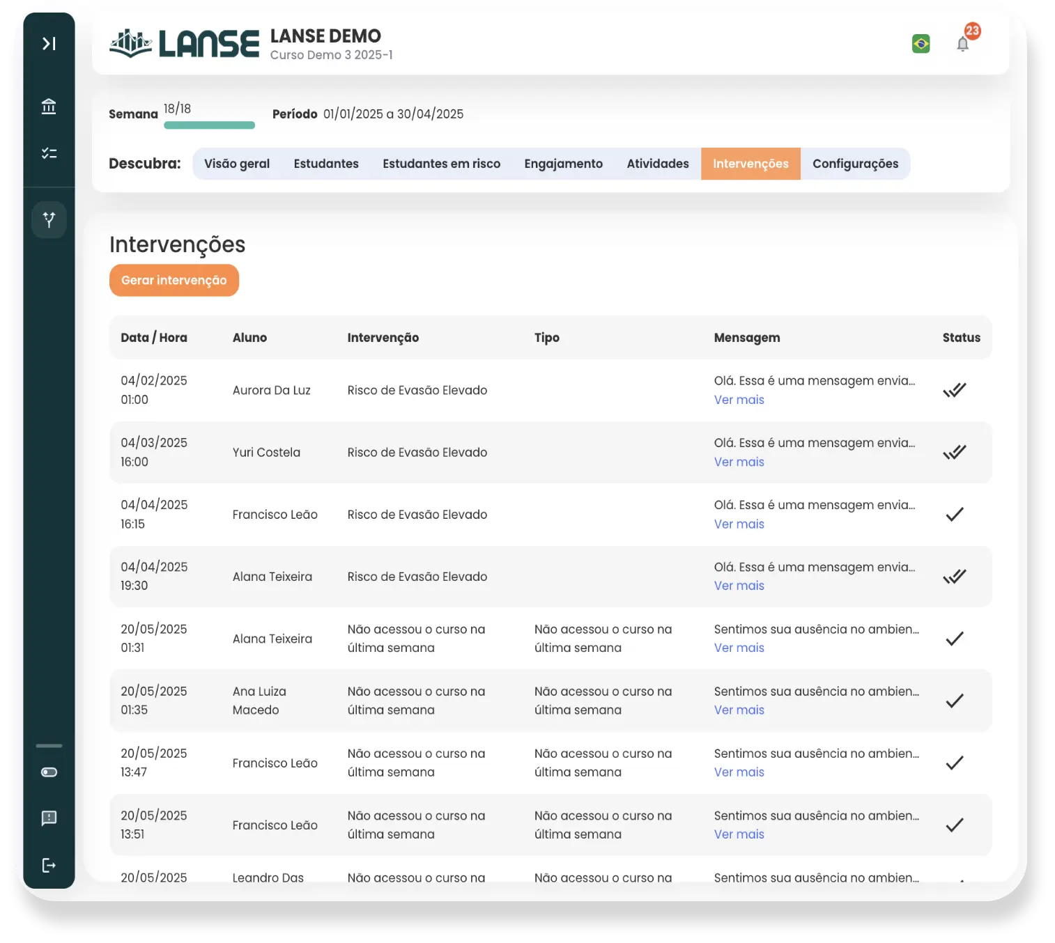 Envie mensagens pré-padronizadas de alerta aos professores com riscos altos de evasão e sugira ações para reverter alunos distantes.